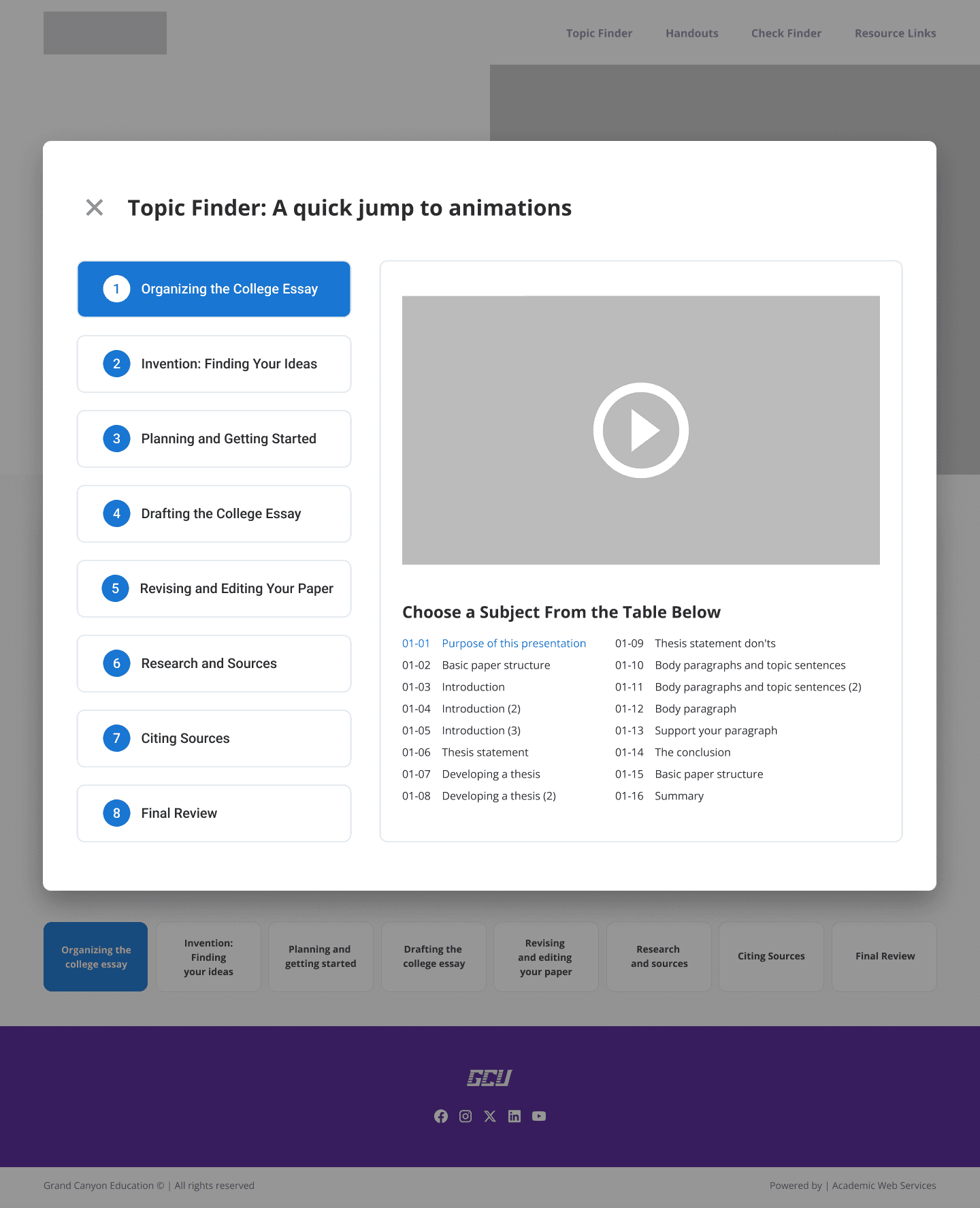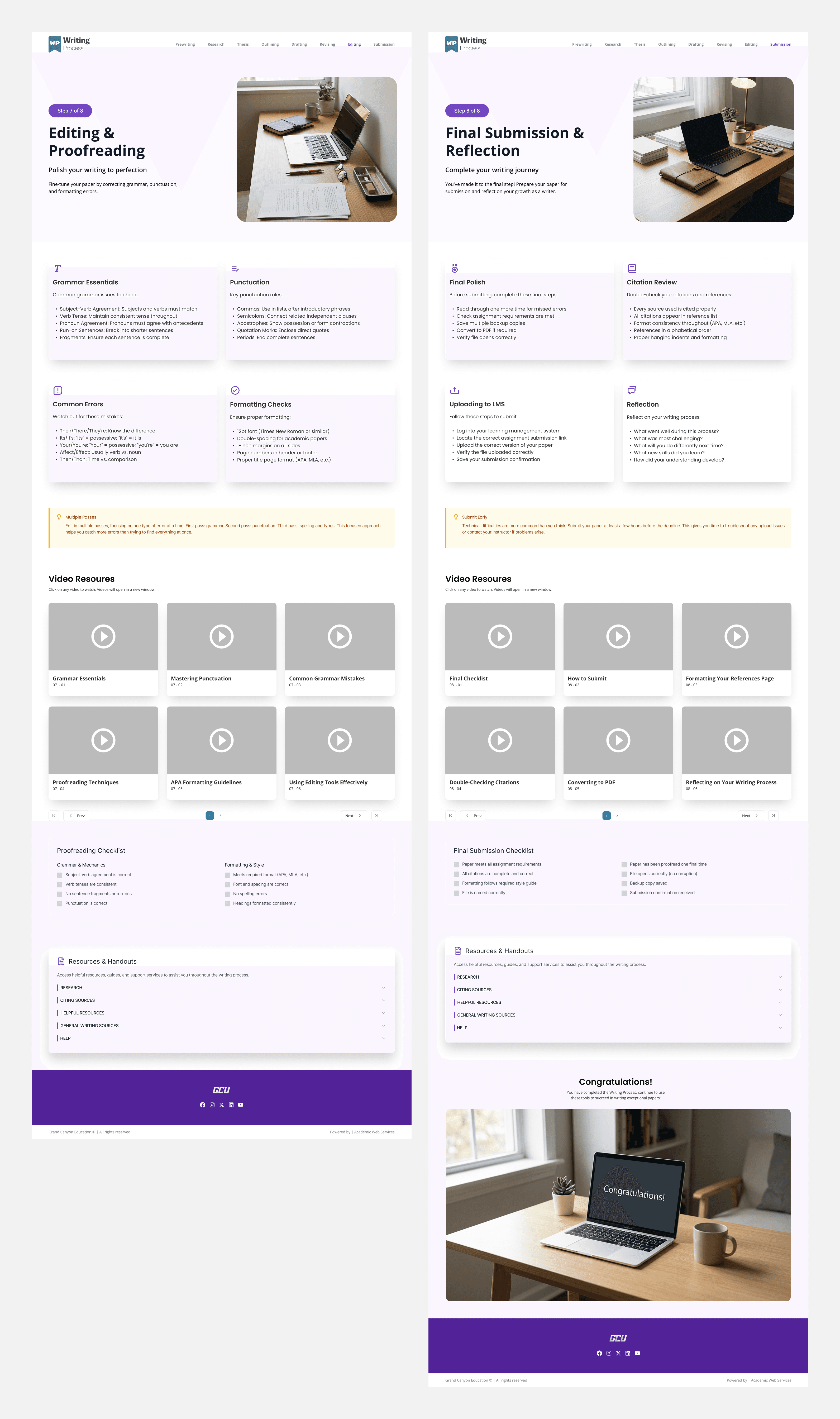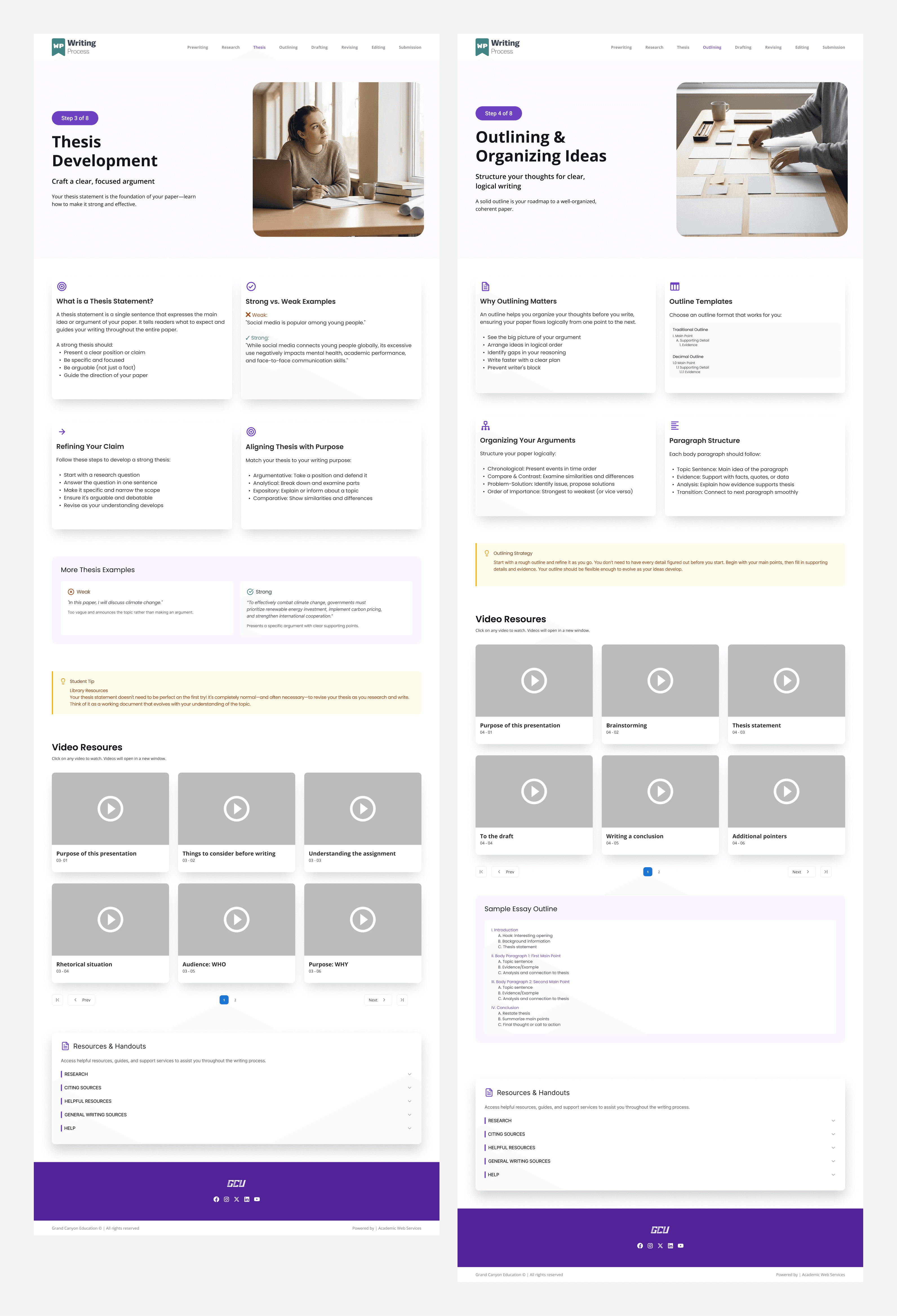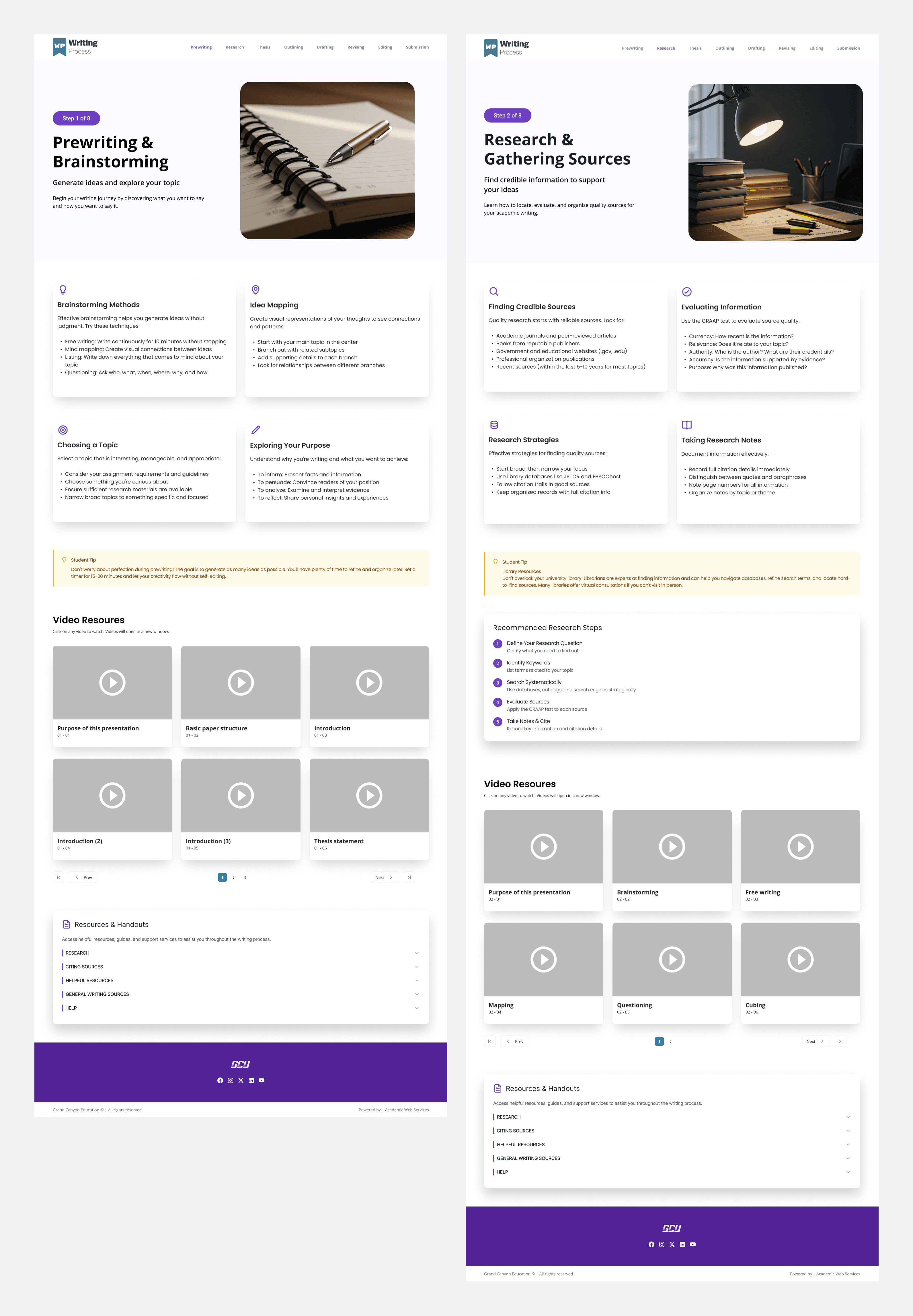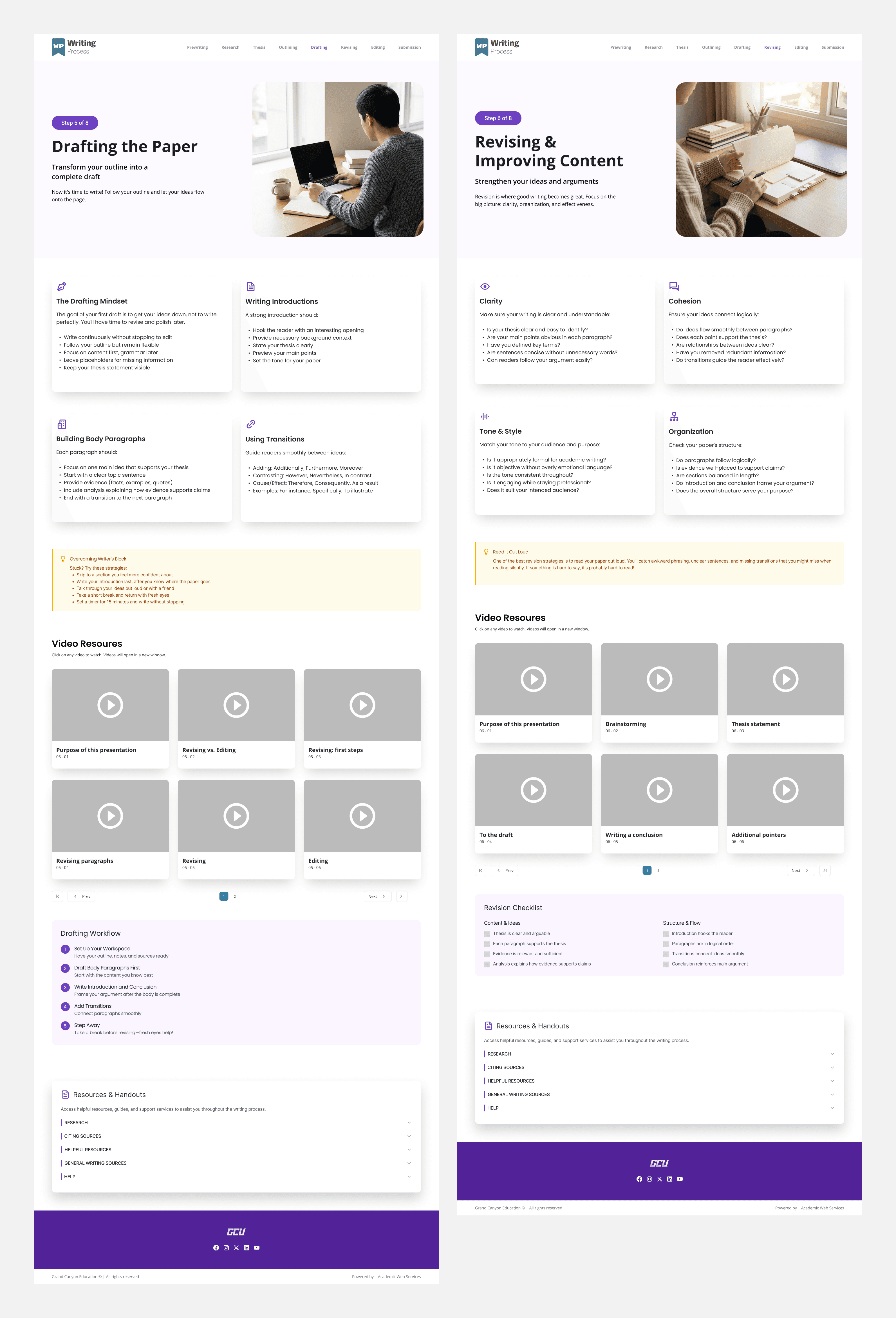 The goal of the redesign was to improve clarity, discoverability, and learning flow, while aligning the experience with GCE’s/GCU's UI design standards. Rather than starting with a fixed solution, the project focused on understanding how students access writing support and iterating toward a structure that best supported that behavior.