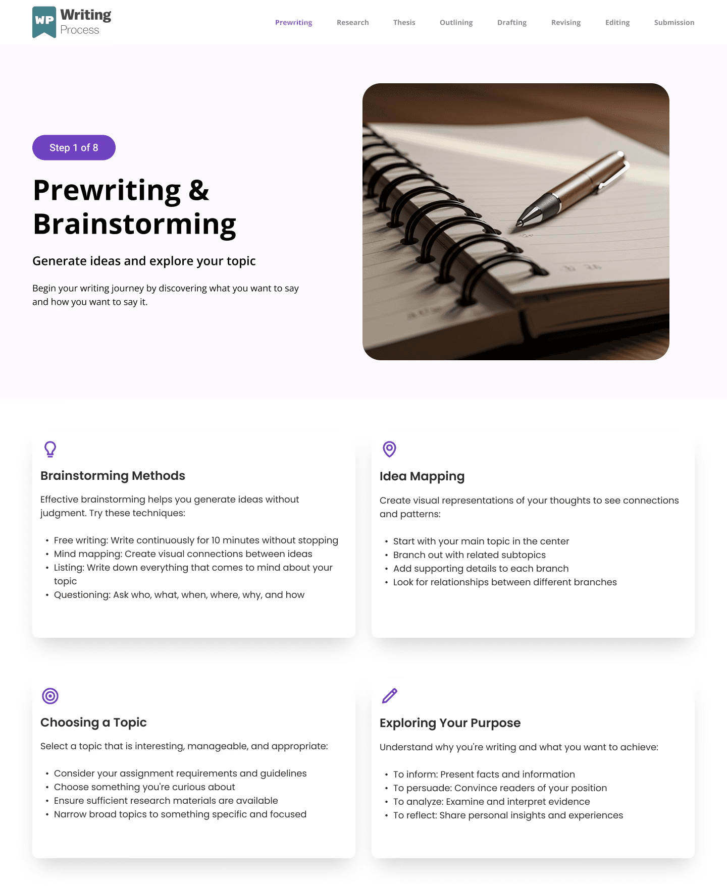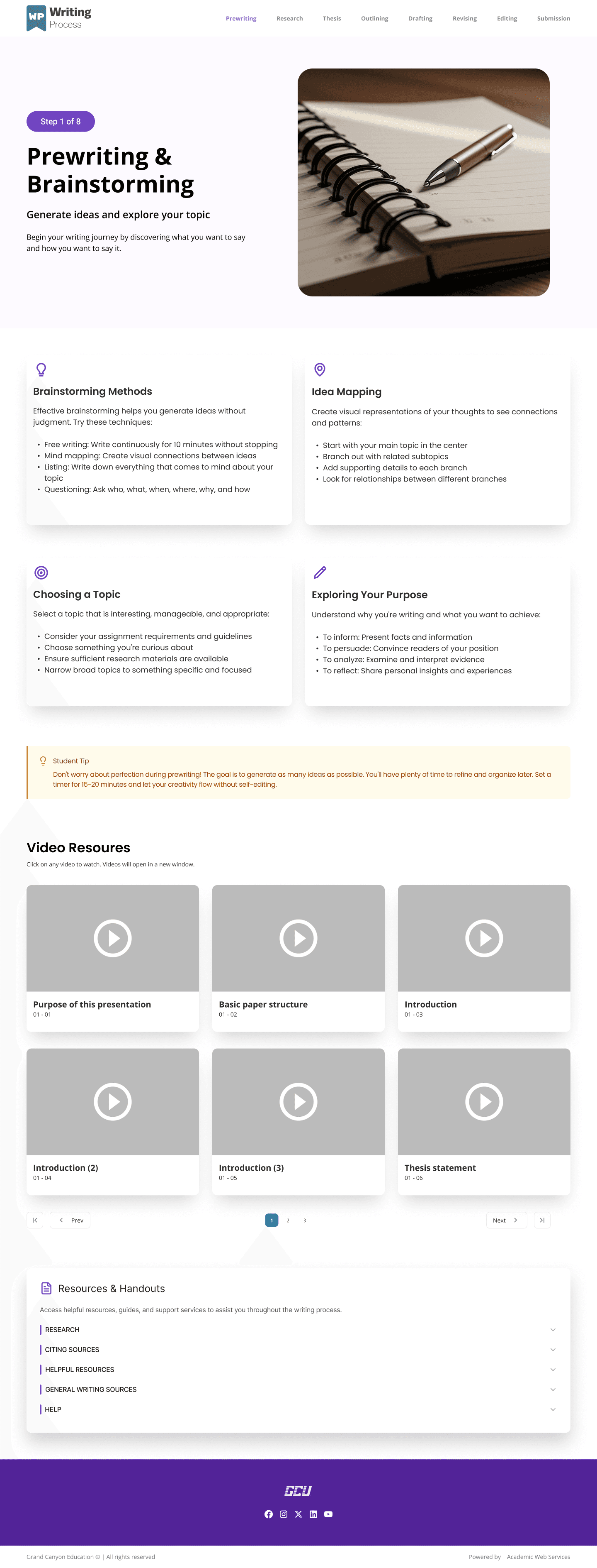 In response, the project shifted direction. Rather than refining the one-page experience further, the design restructured the resource into a linear, eight-page learning flow, with each page dedicated to a single stage of the writing process.