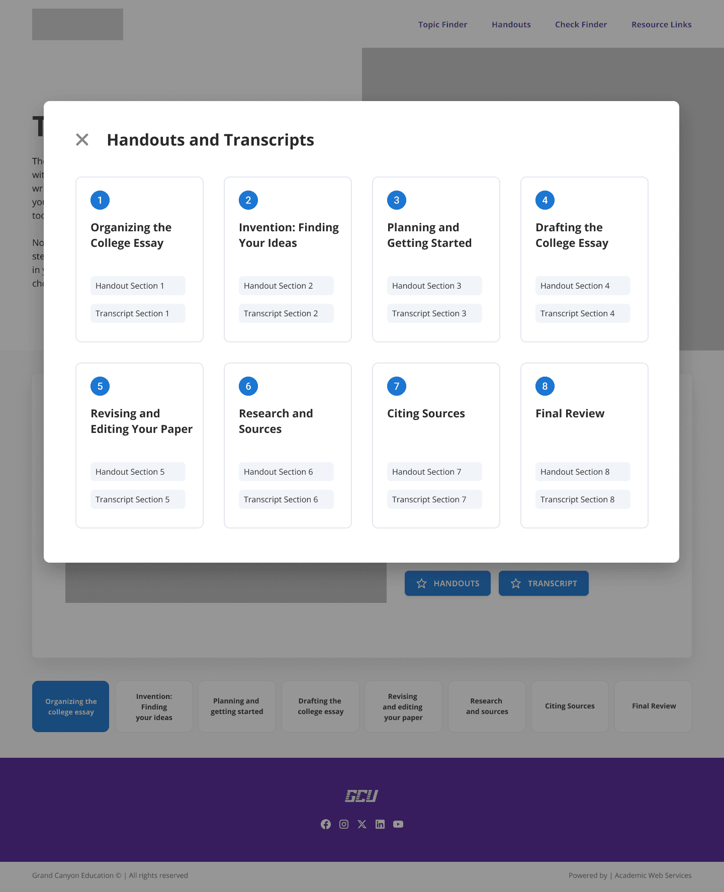 The first design iteration focused on improving clarity within the existing one-page model. Wireframes introduced a centralized landing page with modal-based access to videos, handouts, and transcripts, allowing users to view content without leaving the page.
